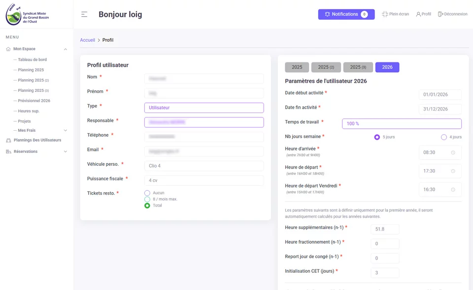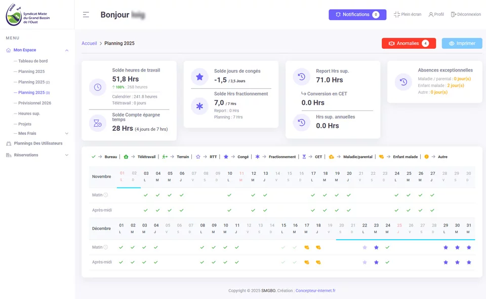 L’outil propose une gestion fine des rôles (administrateur, chef de pôle, utilisateur, comptabilité, direction) et des plannings annuels et mensuels.