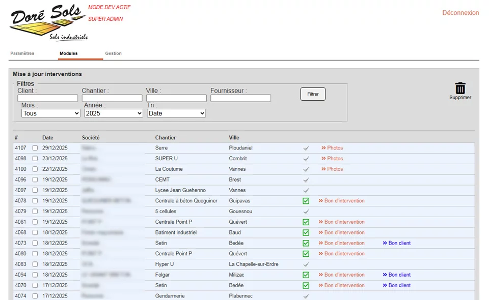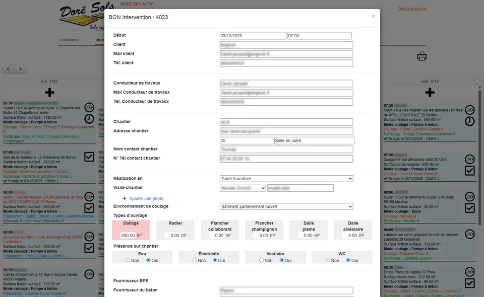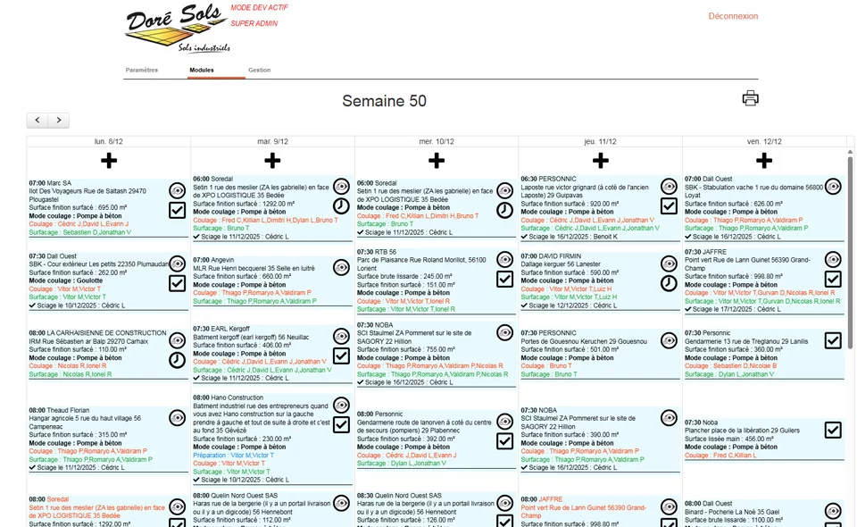 Planification des activités, suivi des interventions et gestion détaillée de chaque chantier, incluant l’ensemble des prestations : préparation, coulage, surfaçage, sciage et nettoyage.